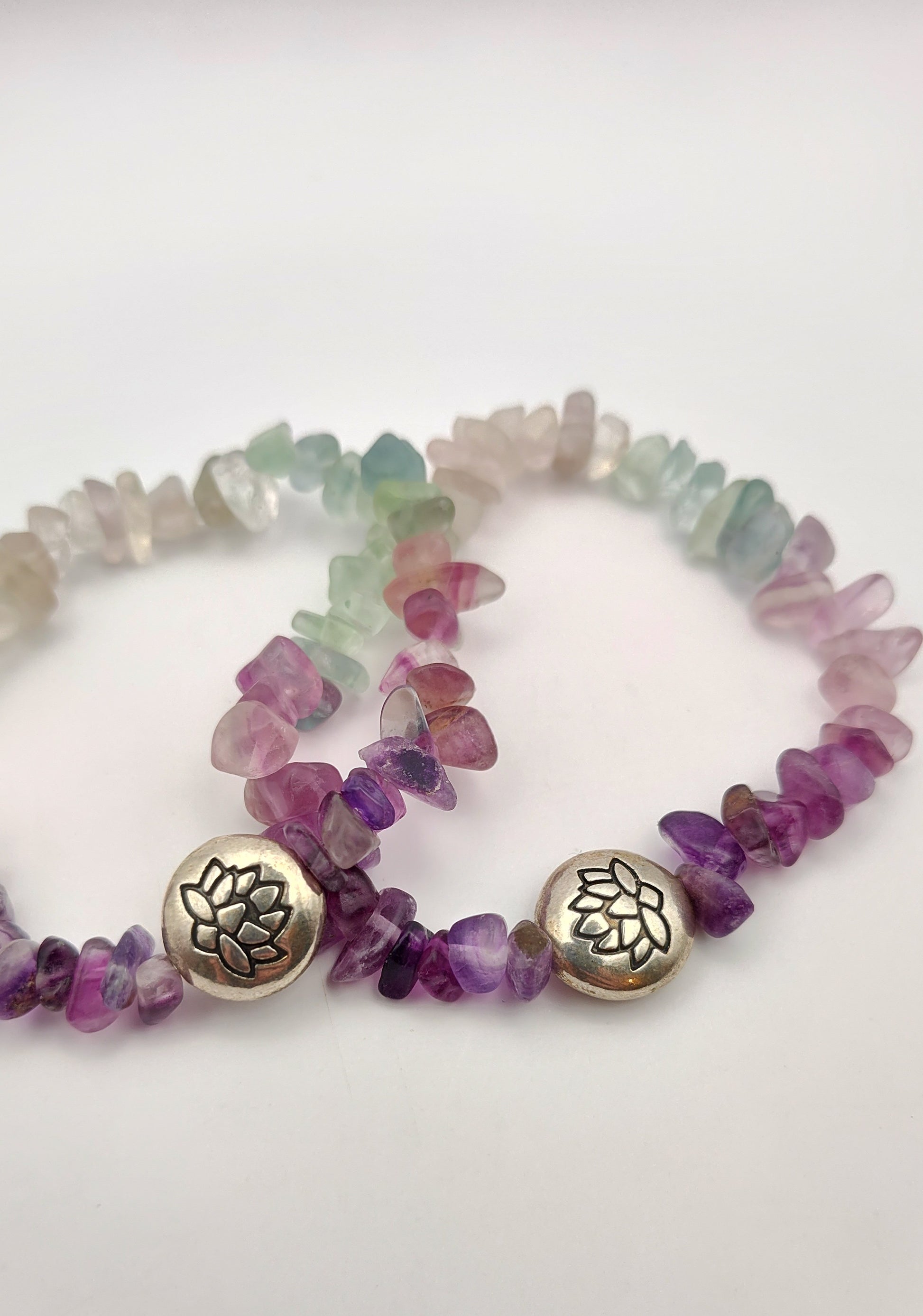 Beautiful Fluorite Chip Bead Bracelet w/ Silver Lotus Beads